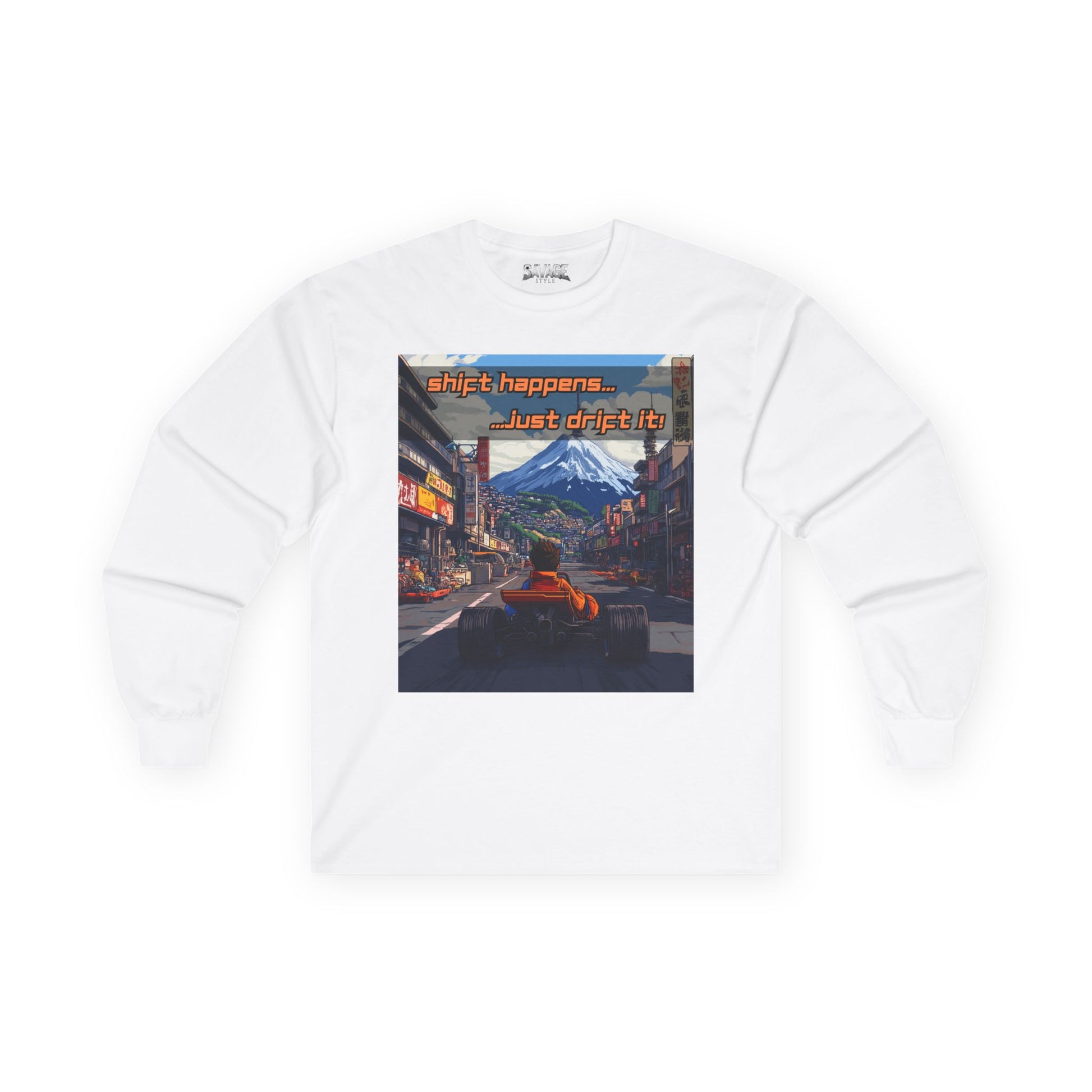 An anime-themed unisex ultra cotton long sleeve tee with a pixel image of a race car driver. The design features the phrase "Shift Happens, Just Drift It" for a fun and edgy look. This tee is perfect for anime lovers and car enthusiasts, adding a touch of cool and casual style to their everyday wardrobe. Ideal for wearing at anime conventions, car shows, or casual hangouts with friends.