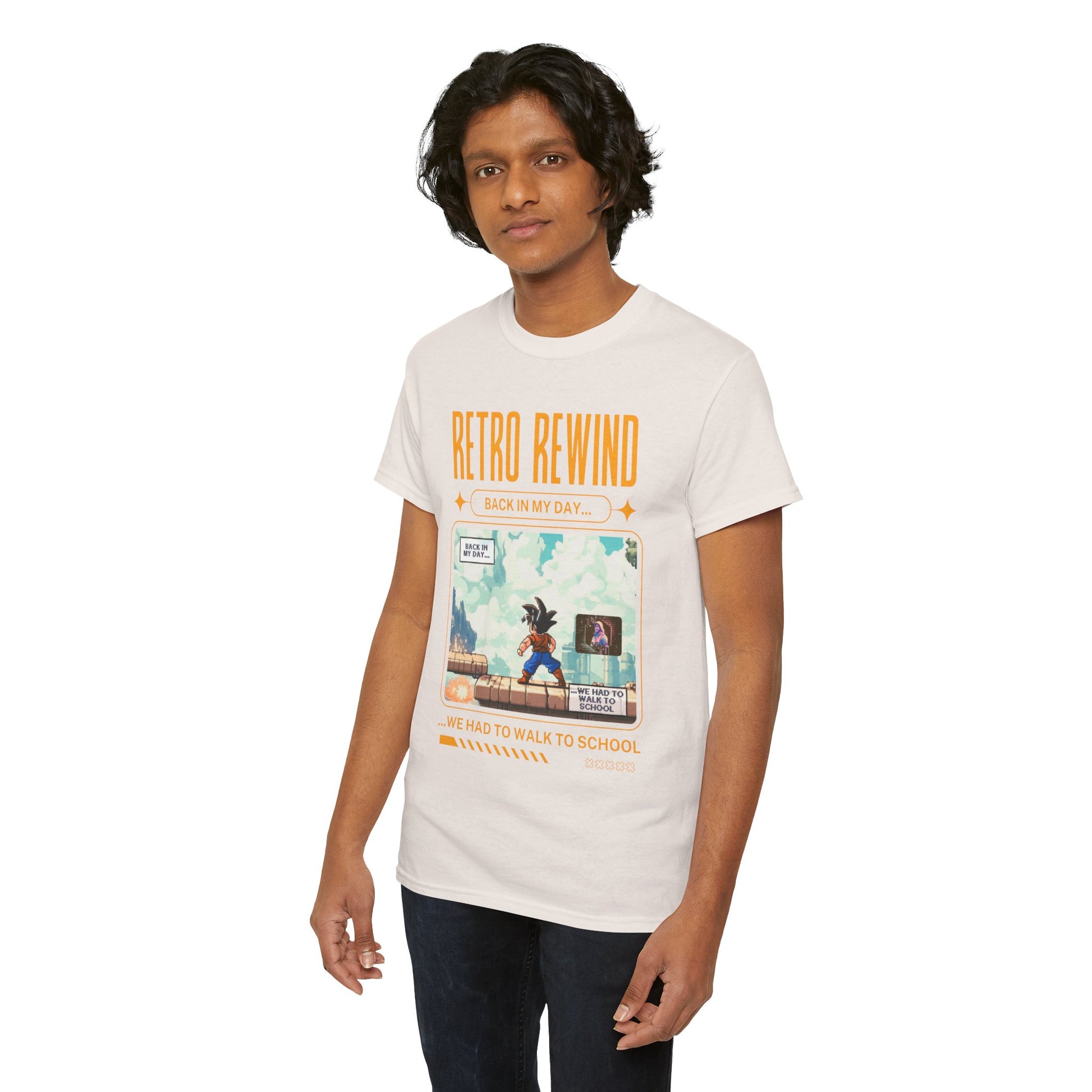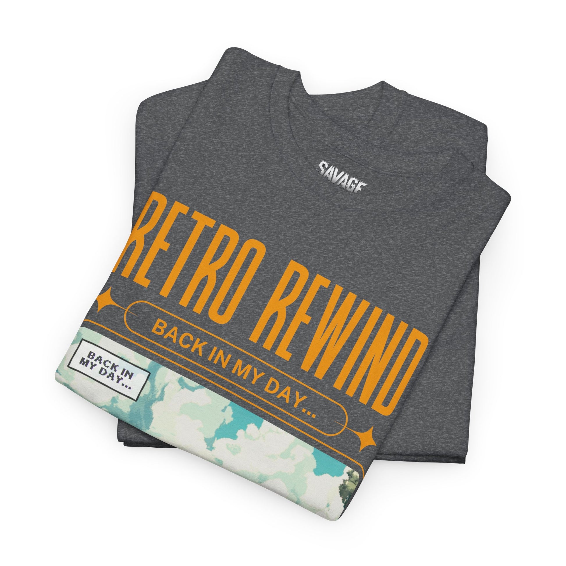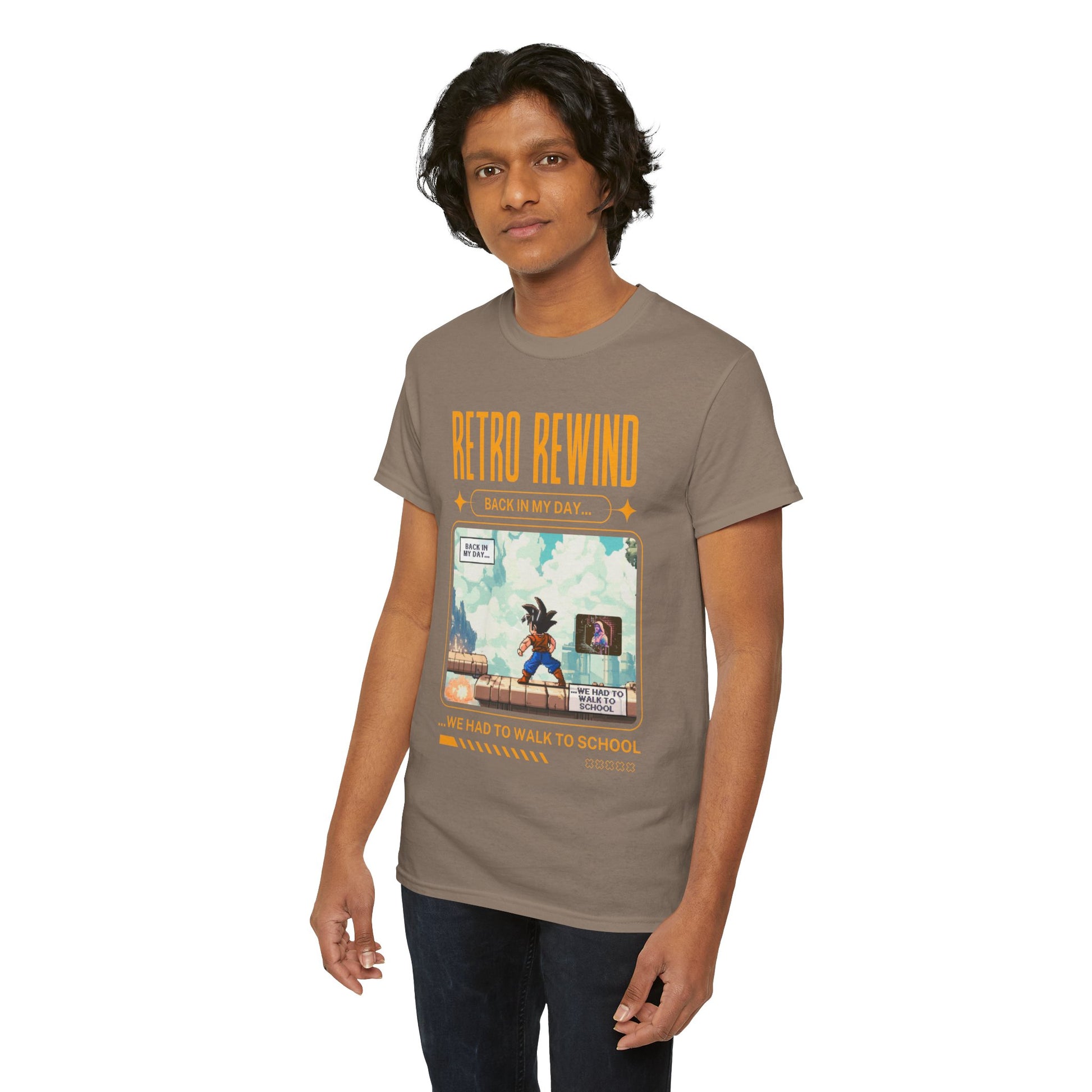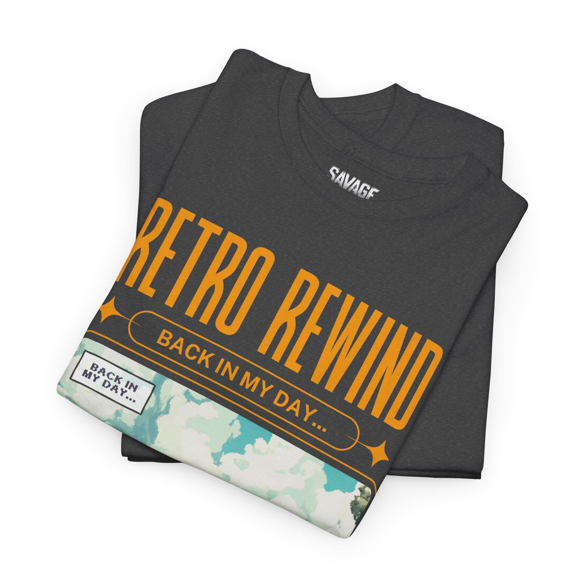 Retro gamer inspired tee shirt "Back In My Day...". This tee gives off a nostalgic and playful vibe, perfect for gamers and pop culture enthusiasts. It can be worn casually or as a statement piece for a fun, relaxed look.