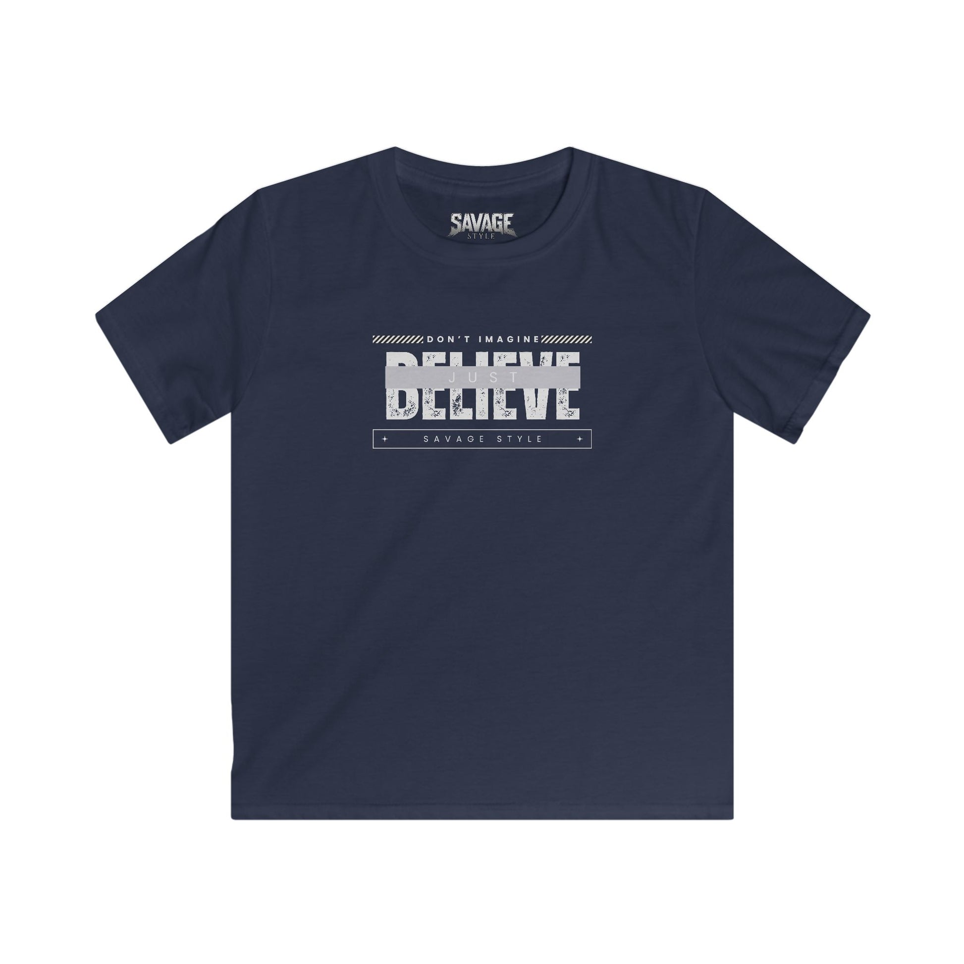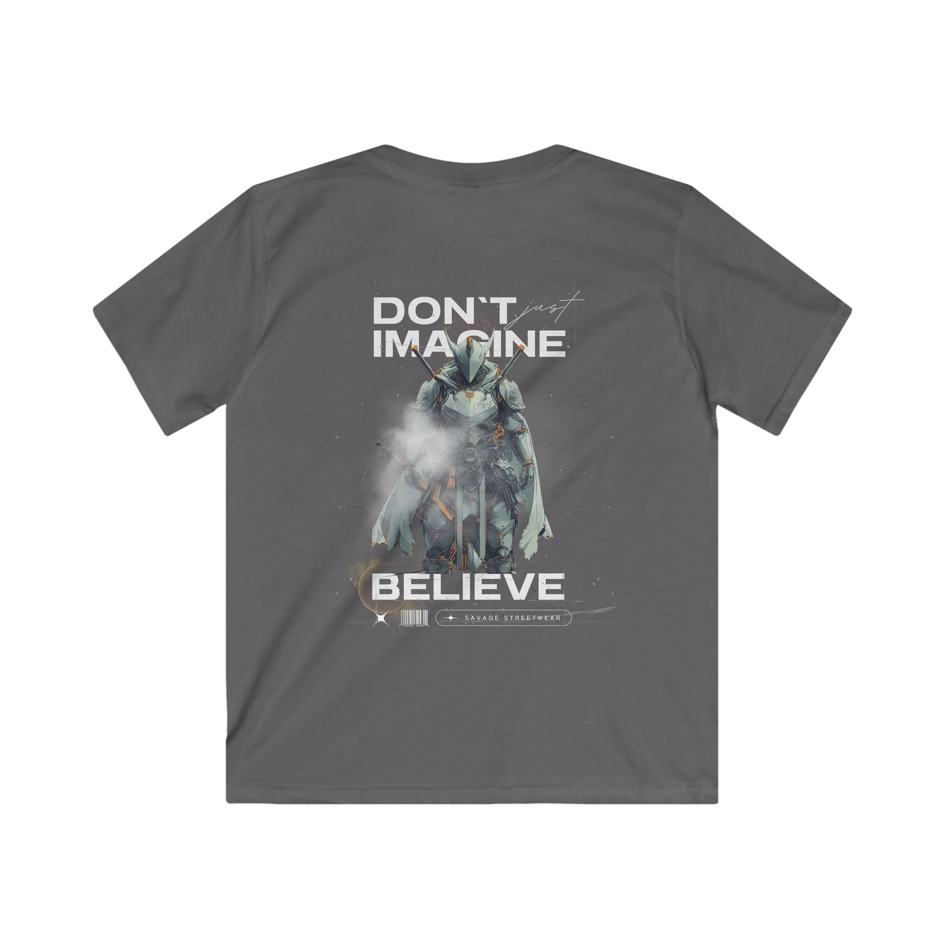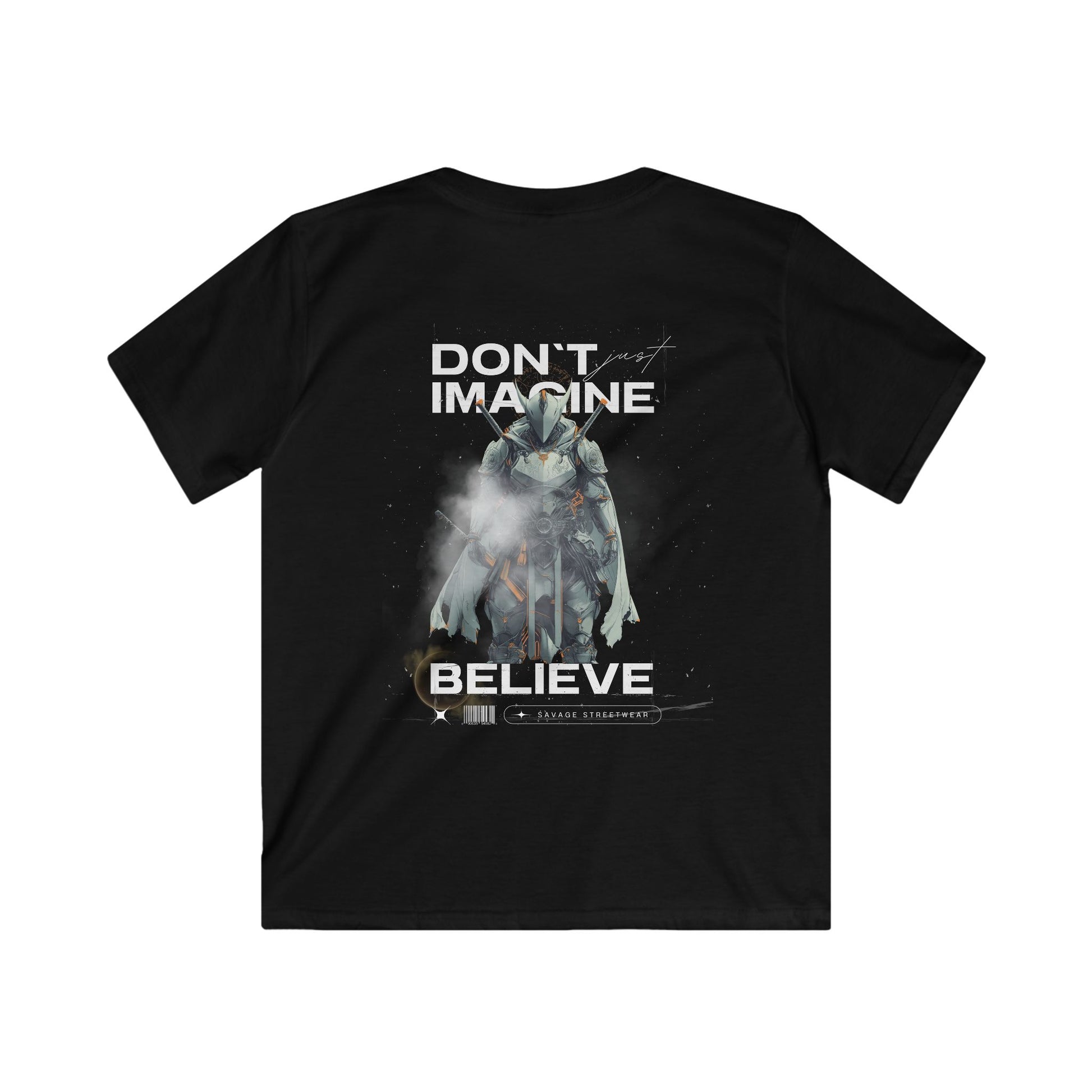 The 'Believe' Kids Tee, perfect for young believers and dreamers. This tee is ideal for kids who love to express their imagination and positivity through their clothing. Suitable for everyday wear, playdates, and themed parties.