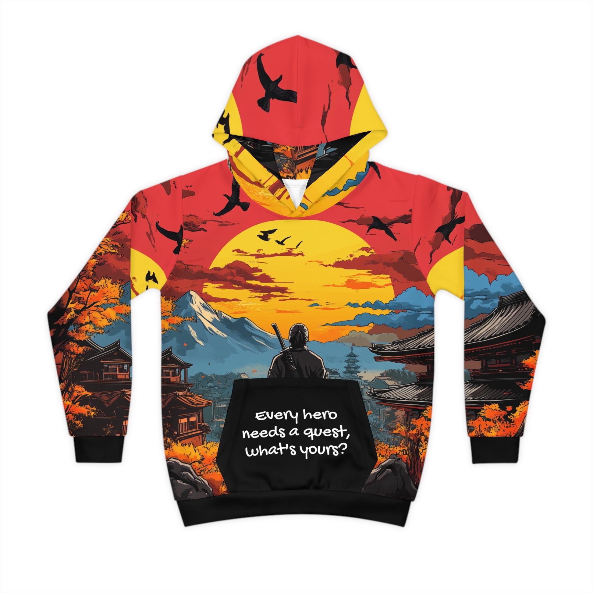 An anime-inspired hero Children's Hoodie with the slogan, Every Hero Needs a Quest. This super soft and lightweight hoodie features a front kangaroo pocket, a custom inside label, and a double layer hood for extra comfort and warmth. Perfect for children who love anime and need a cozy sweatshirt for leisure or playtime.