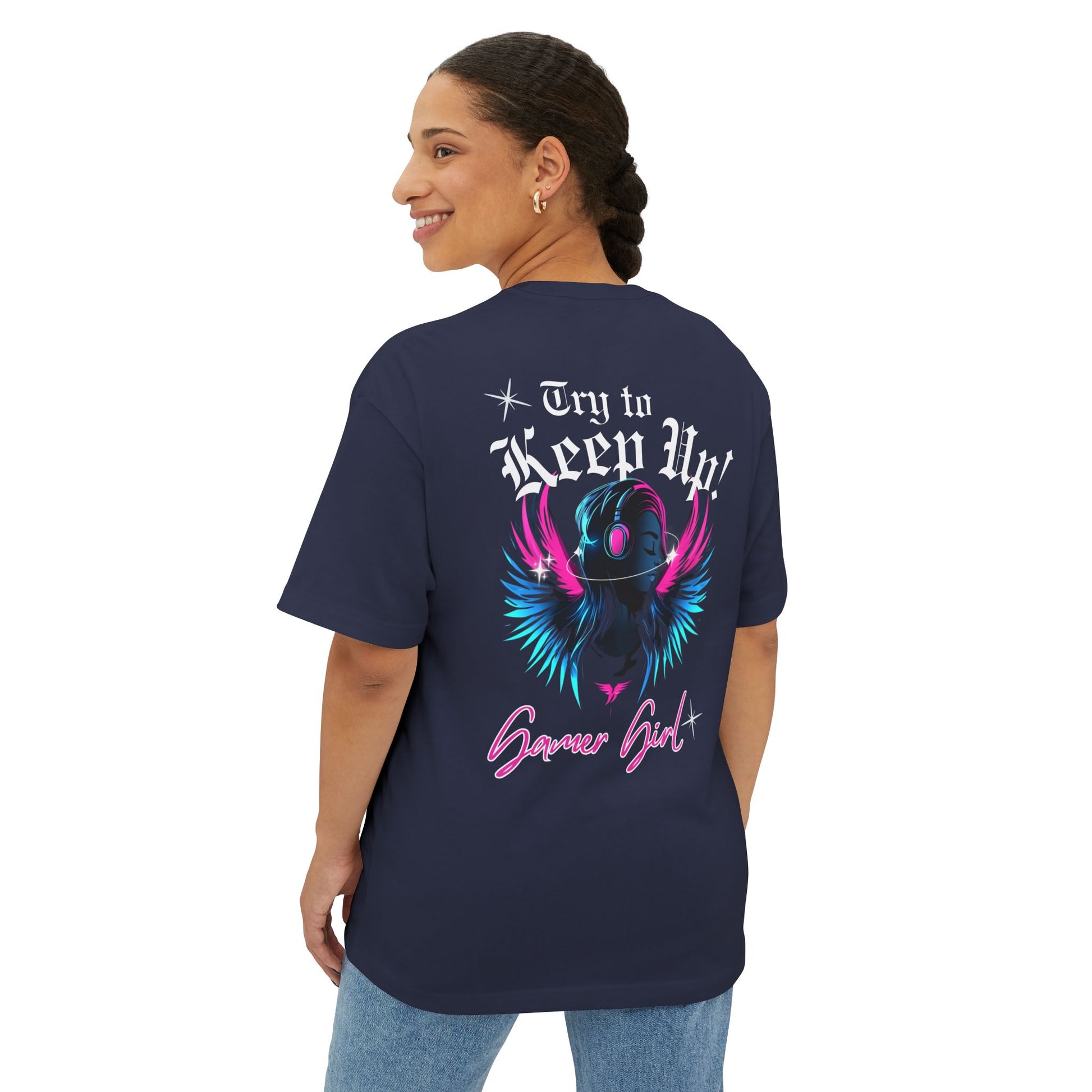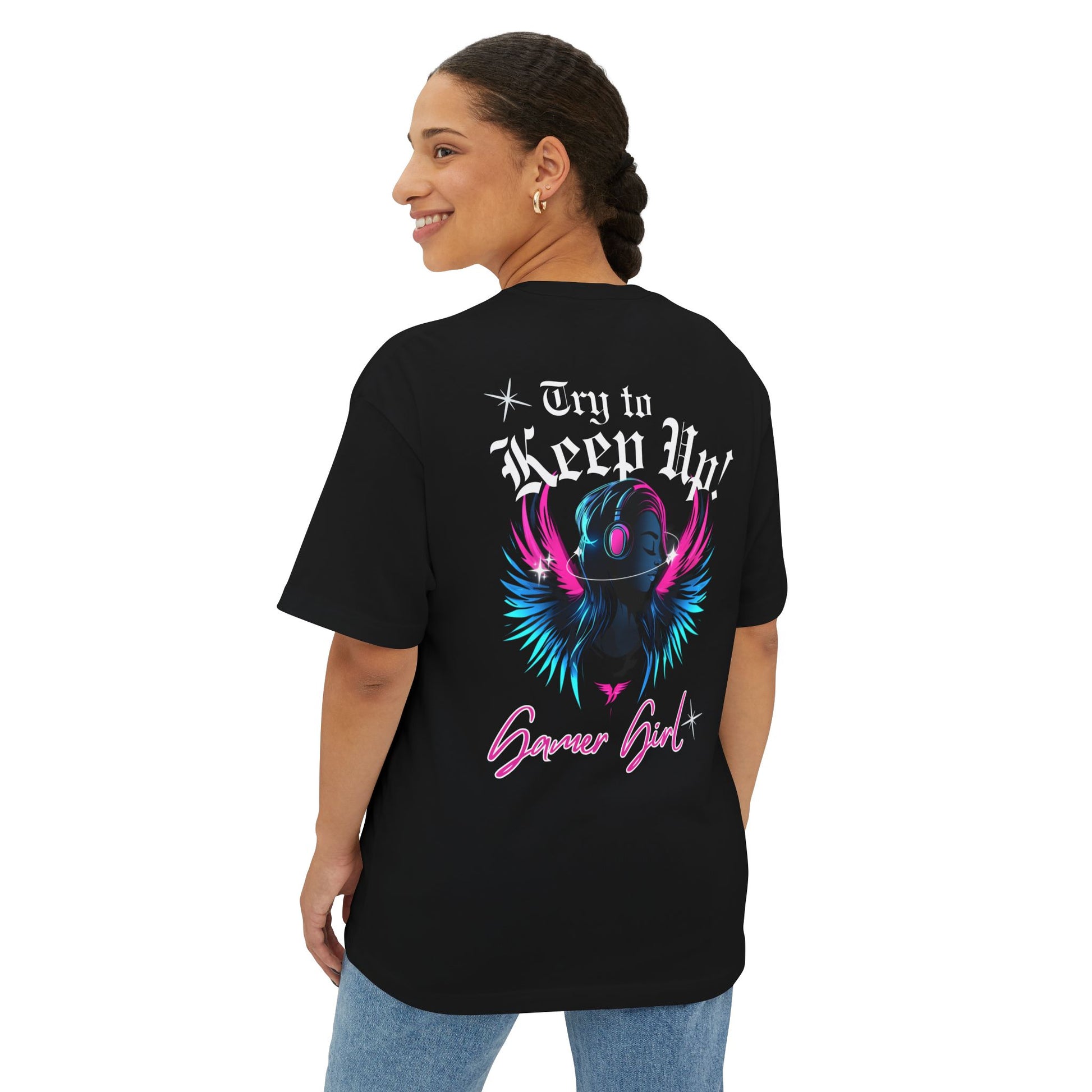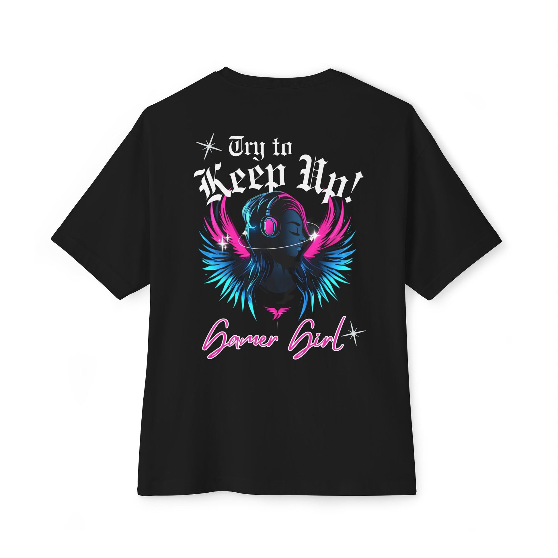 This Gamer Girl - Try to keep up T-Shirt is the perfect addition to any gamer's wardrobe. The oversized boxy fit provides a relaxed and comfortable feel, making it ideal for long gaming sessions. It is relevant to gamers who enjoy showcasing their love for gaming in a stylish and casual way. Perfect for casual gaming nights with friends or streaming sessions. Great for birthdays, holidays, and gaming events.