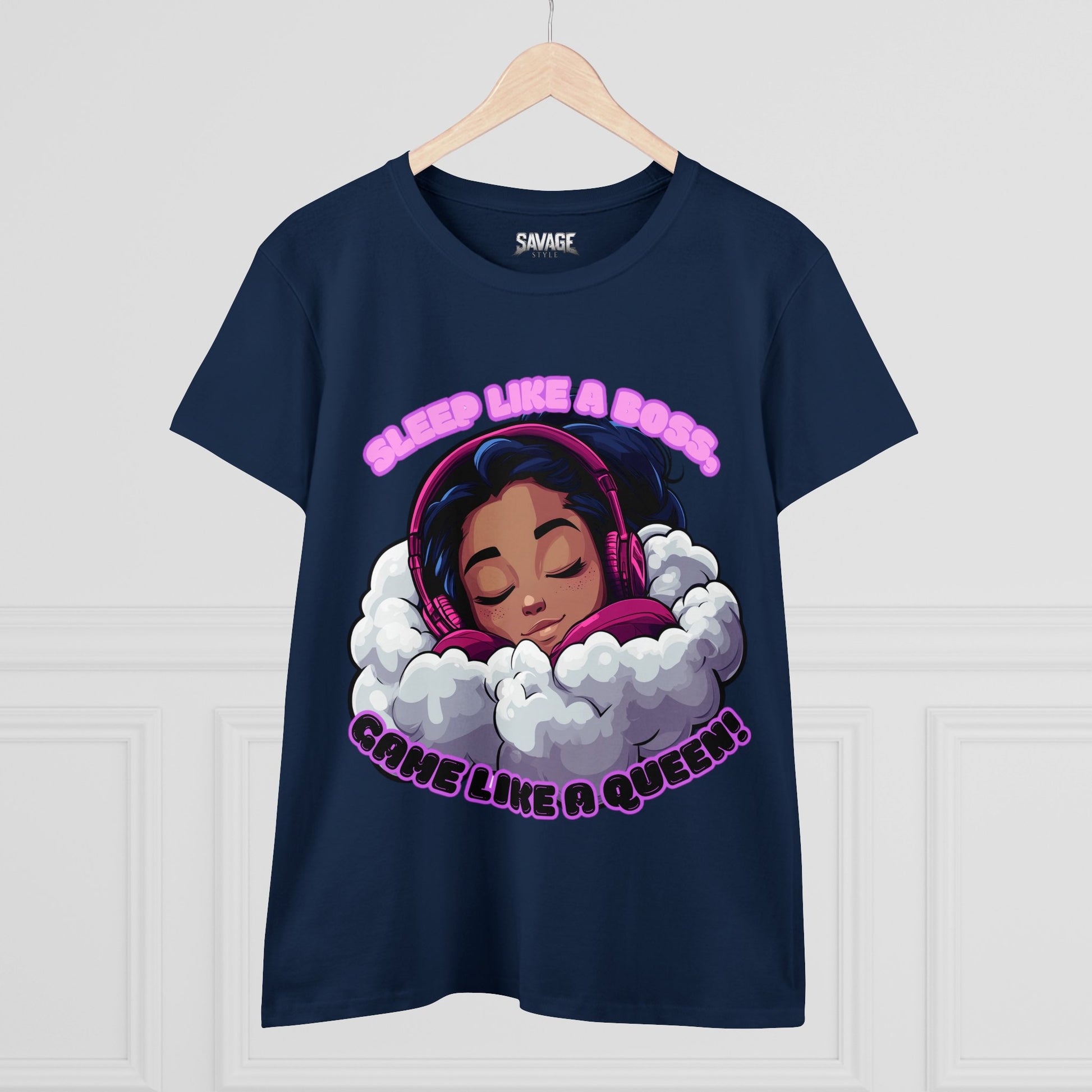 Sleep Like a Boss, Game Like a Queen Tee is a midweight cotton shirt that offers a comfortable fit and durable construction. Perfect for women who want to lounge or game in style, this tee is relevant for casual wear and gaming events. Ideal for sleepovers, game nights, and casual hangouts with friends.