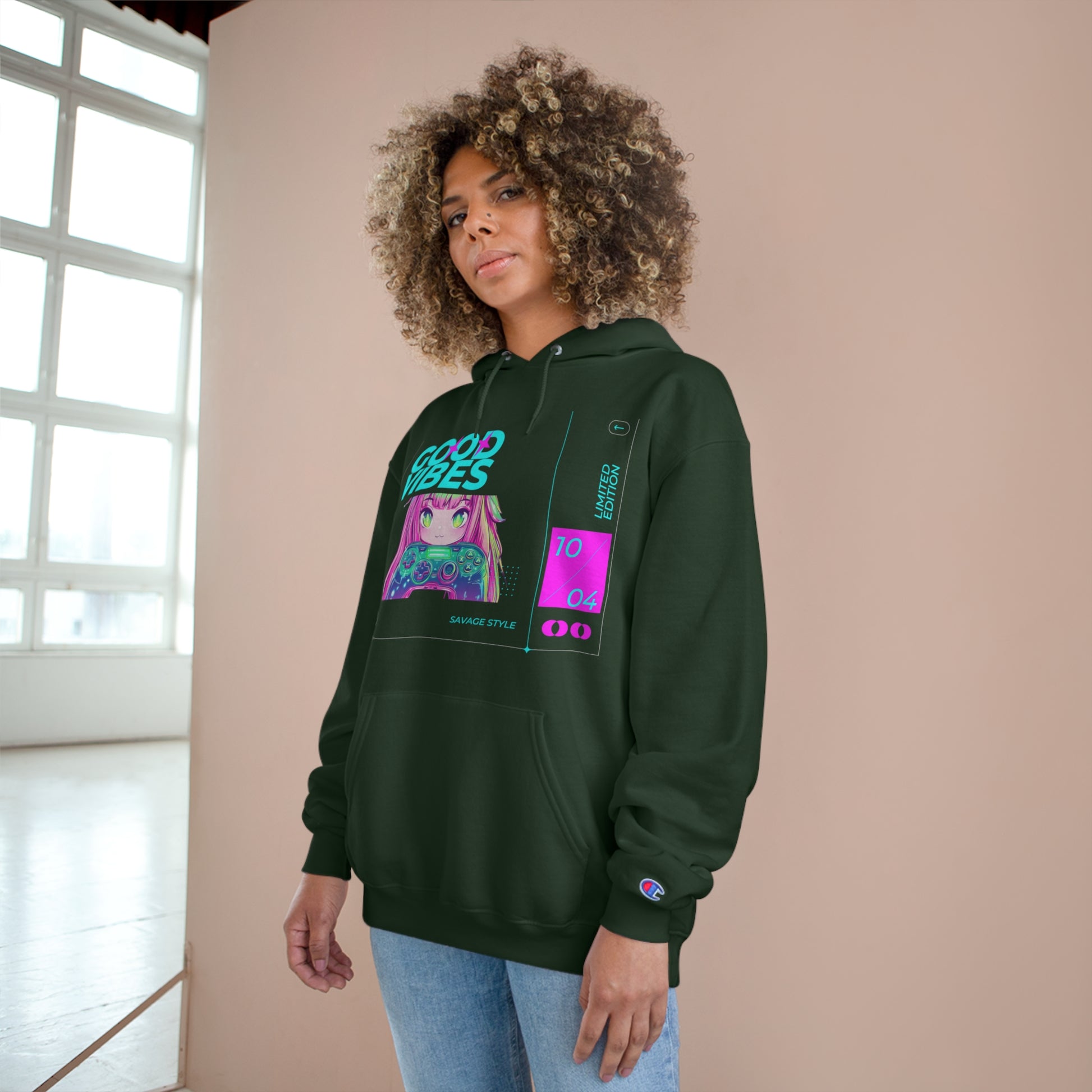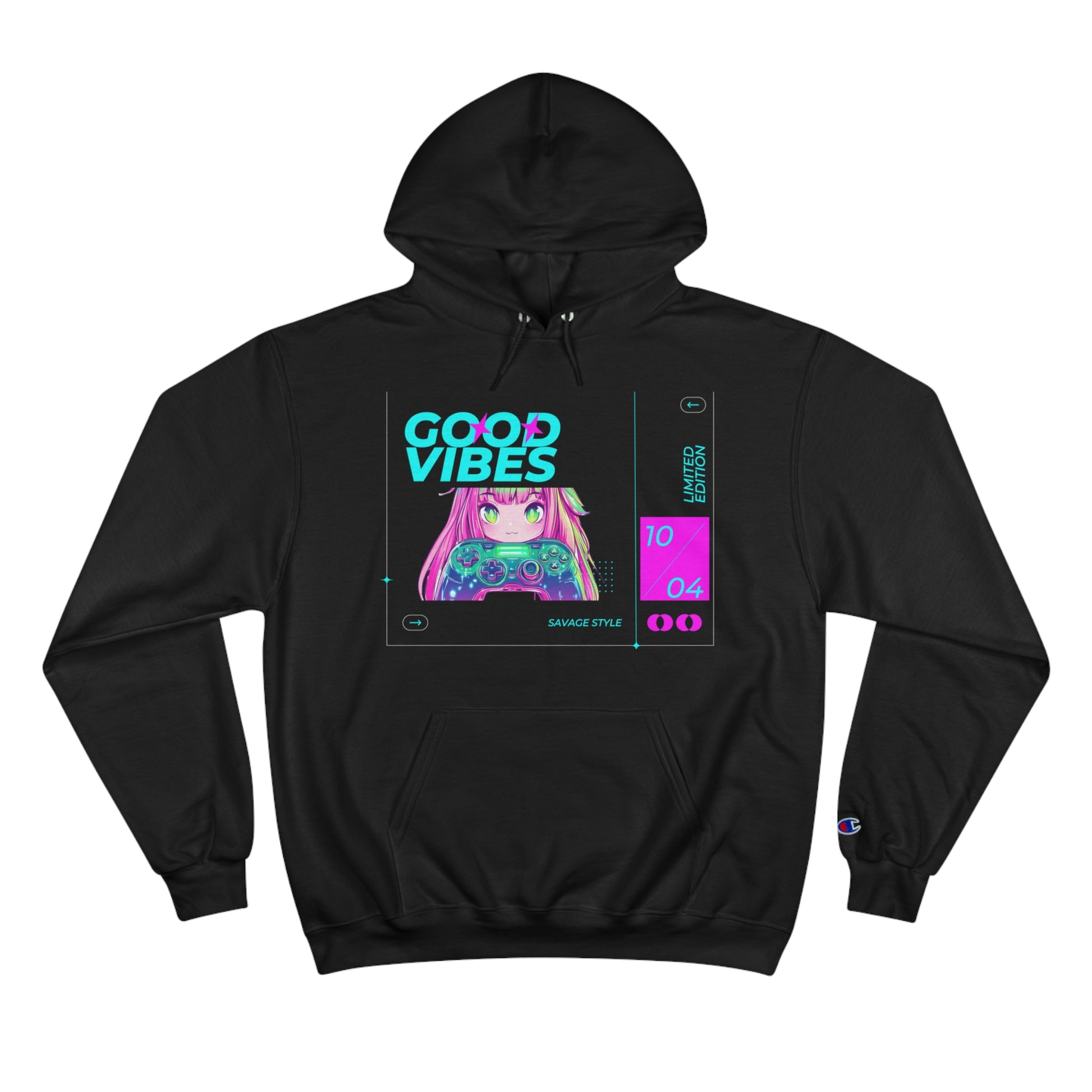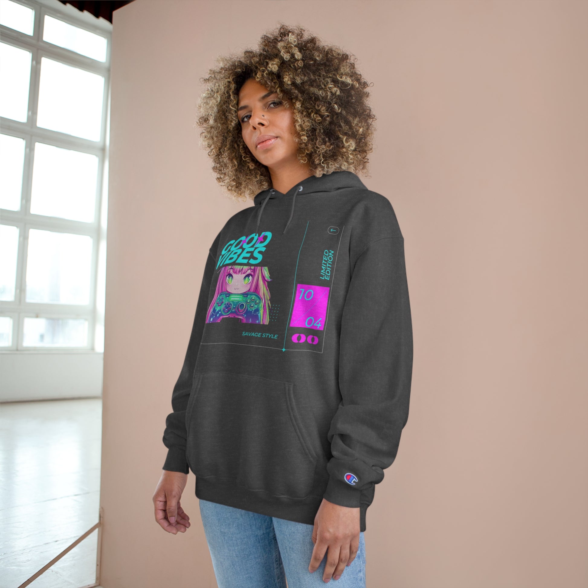 Good Vibes Champion Hoodie - Anime Gamer girl hoodie giving off a cozy and casual vibe. Perfect for gamers, anime lovers, and anyone looking for a comfortable and stylish hoodie. Ideal for casual wear, lounging at home, or attending gaming conventions and anime events.