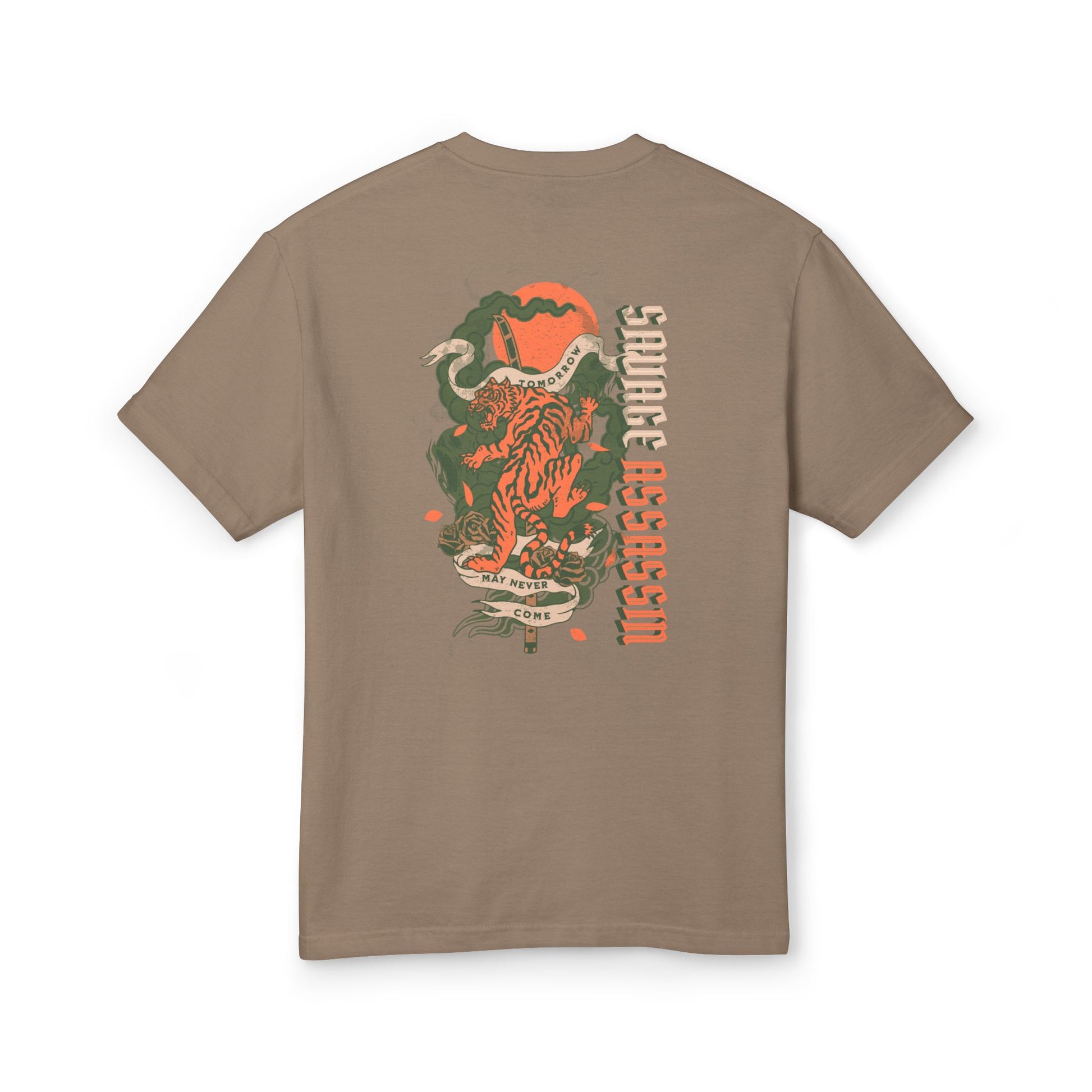 The Savage Assassin T-Shirt is a heavy, garment-dyed cotton tee with a relaxed fit and a vintage color and texture. Perfect for those who love edgy, bold designs, this tee is ideal for casual wear or making a statement.