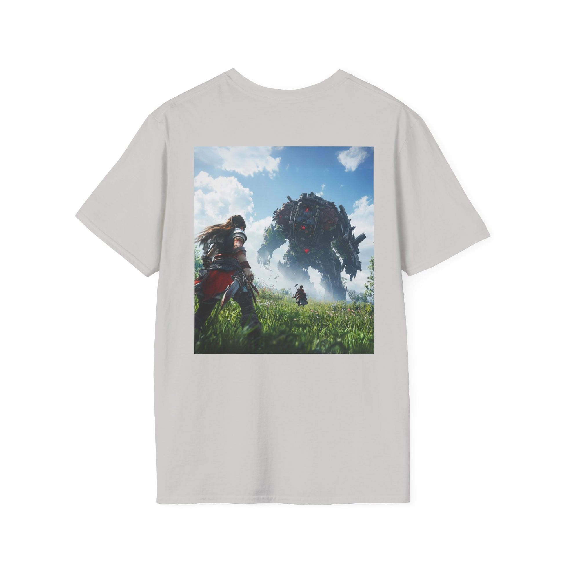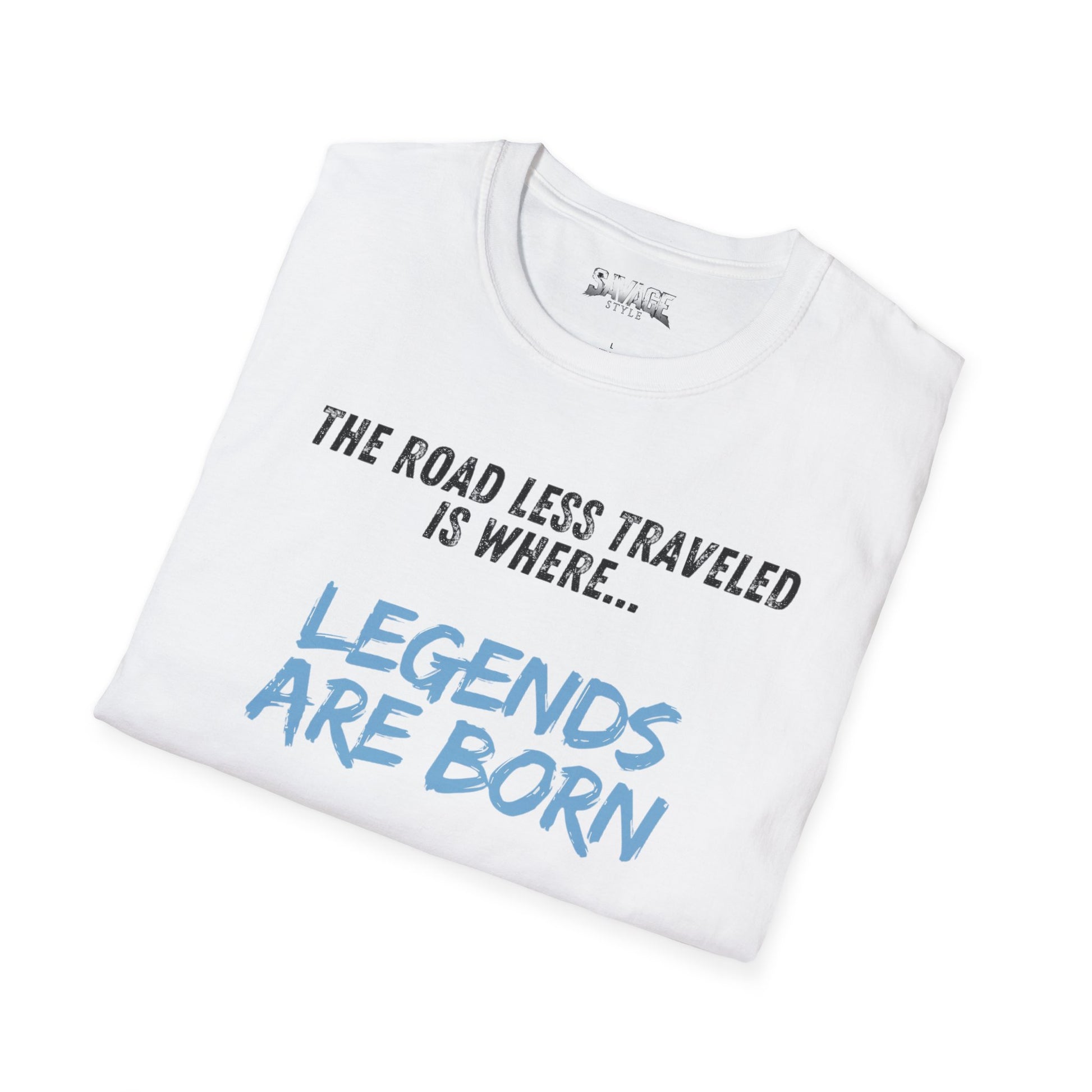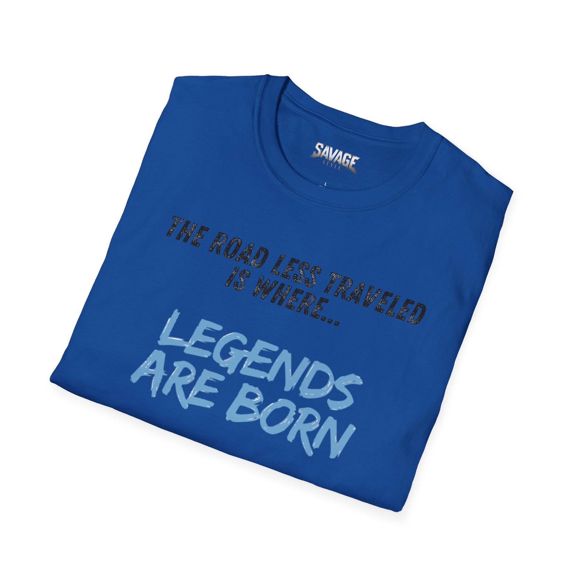 The unisex soft-style t-shirt features the quote 'The Road Less Traveled is Where Legends Are Born' on the front, along with a graphic picture of an epic Titan Boss battle. Perfect for gamers and fans of epic adventures, this tee exudes a bold and adventurous vibe. Great for everyday wear or as a statement piece for gaming conventions or casual wear.