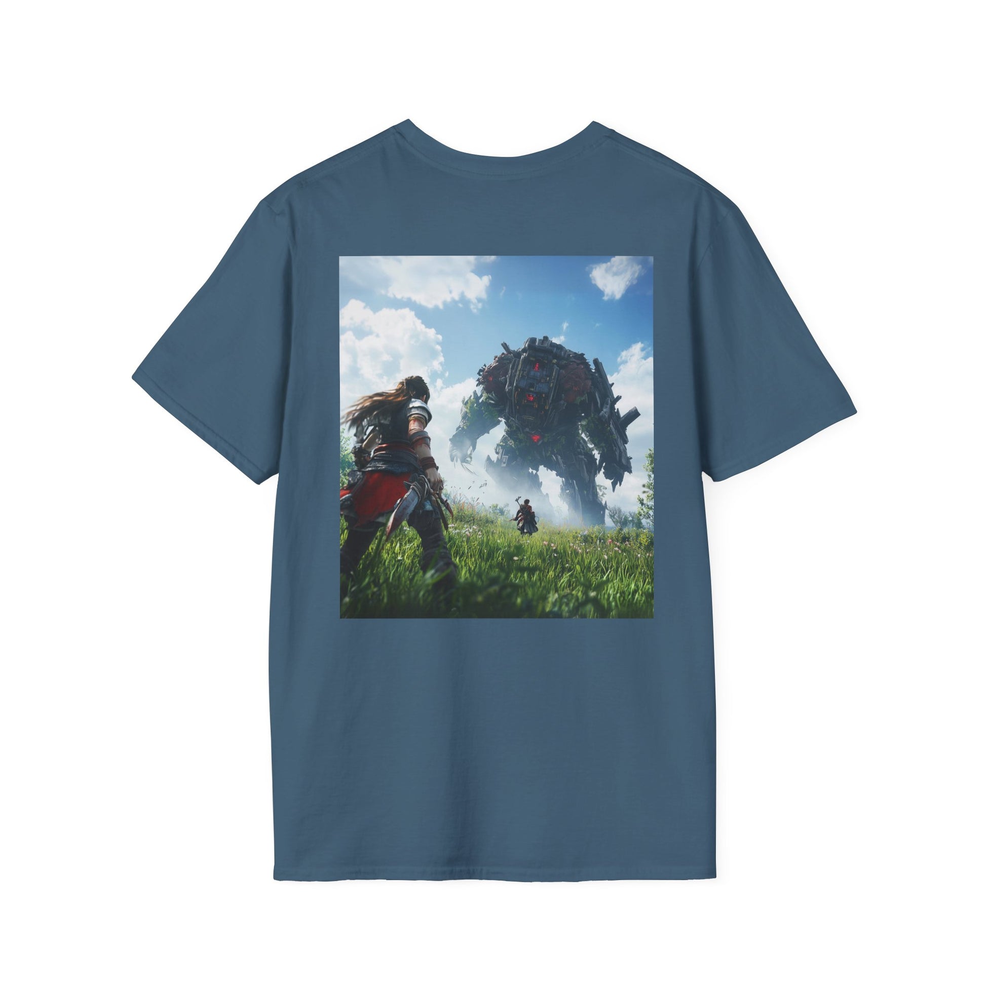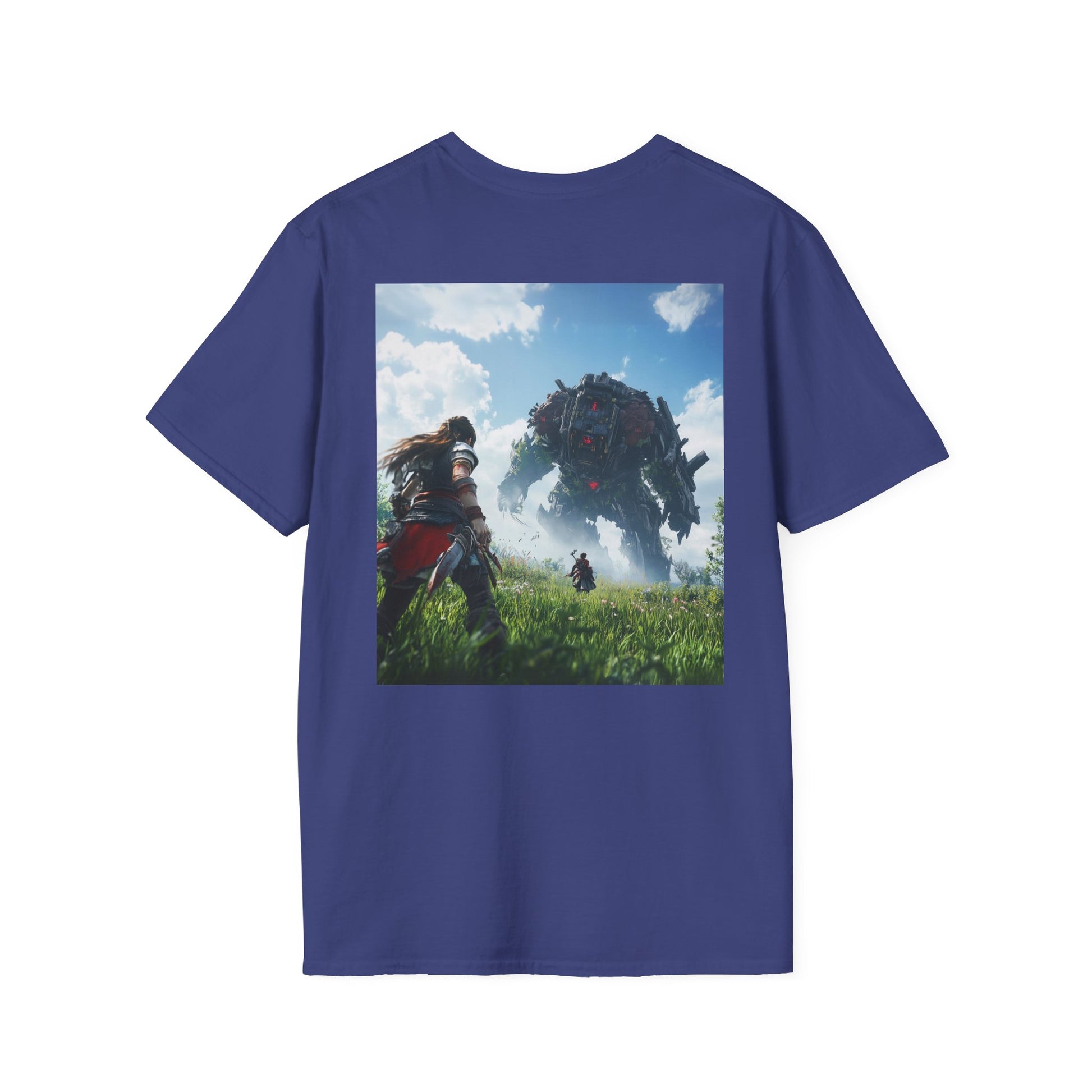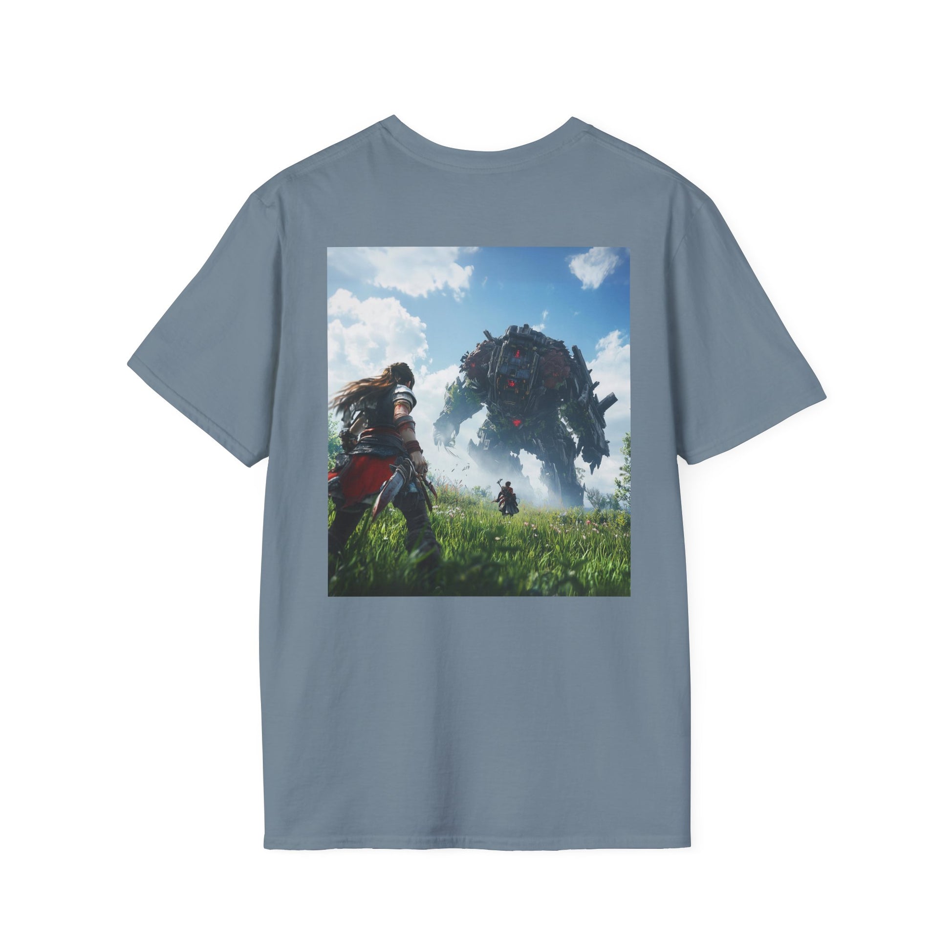 The unisex soft-style t-shirt features the quote 'The Road Less Traveled is Where Legends Are Born' on the front, along with a graphic picture of an epic Titan Boss battle. Perfect for gamers and fans of epic adventures, this tee exudes a bold and adventurous vibe. Great for everyday wear or as a statement piece for gaming conventions or casual wear.