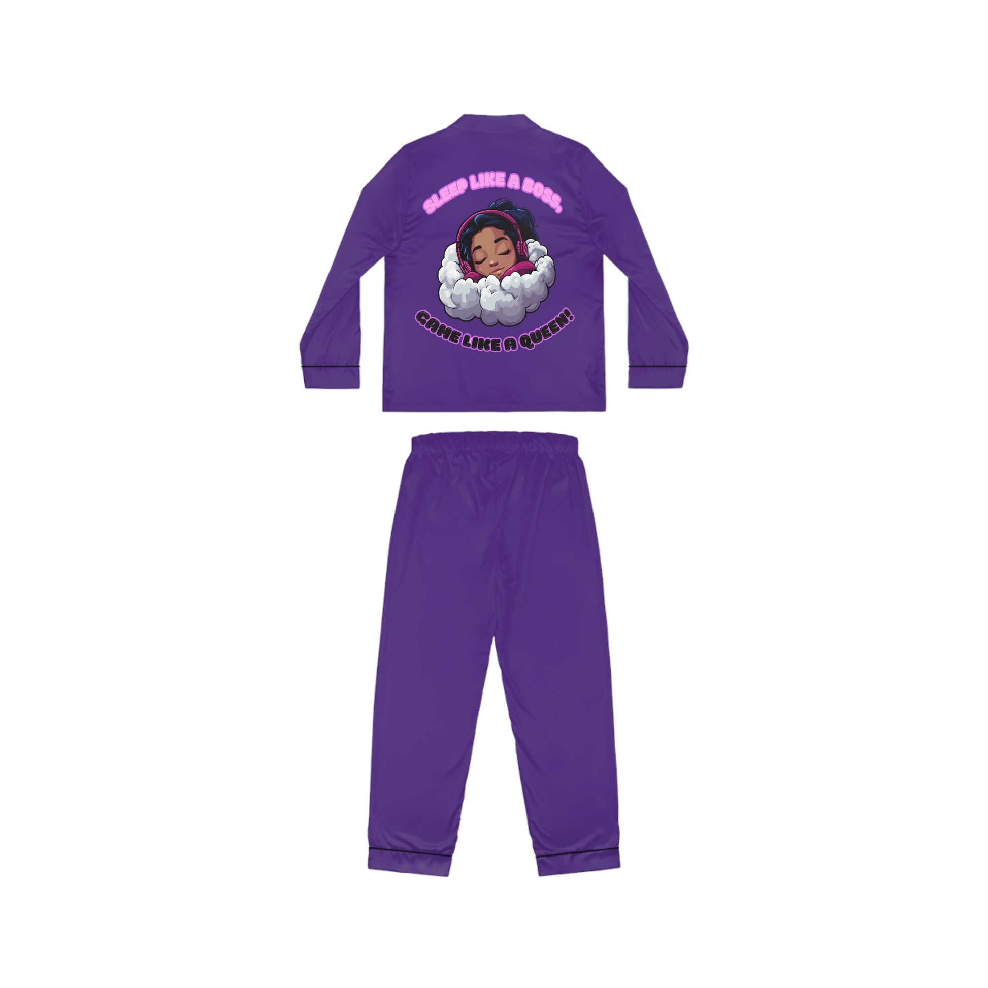 Women's Satin Sleep Like a Boss, Game Like a Queen Pajama set for the video gamer lifestyle, featuring a drawstring waist, notch lapel collar, and a soft satiny texture. Perfect for the female gamer looking for stylish and comfortable loungewear. Ideal for holidays, birthdays, or special occasions.